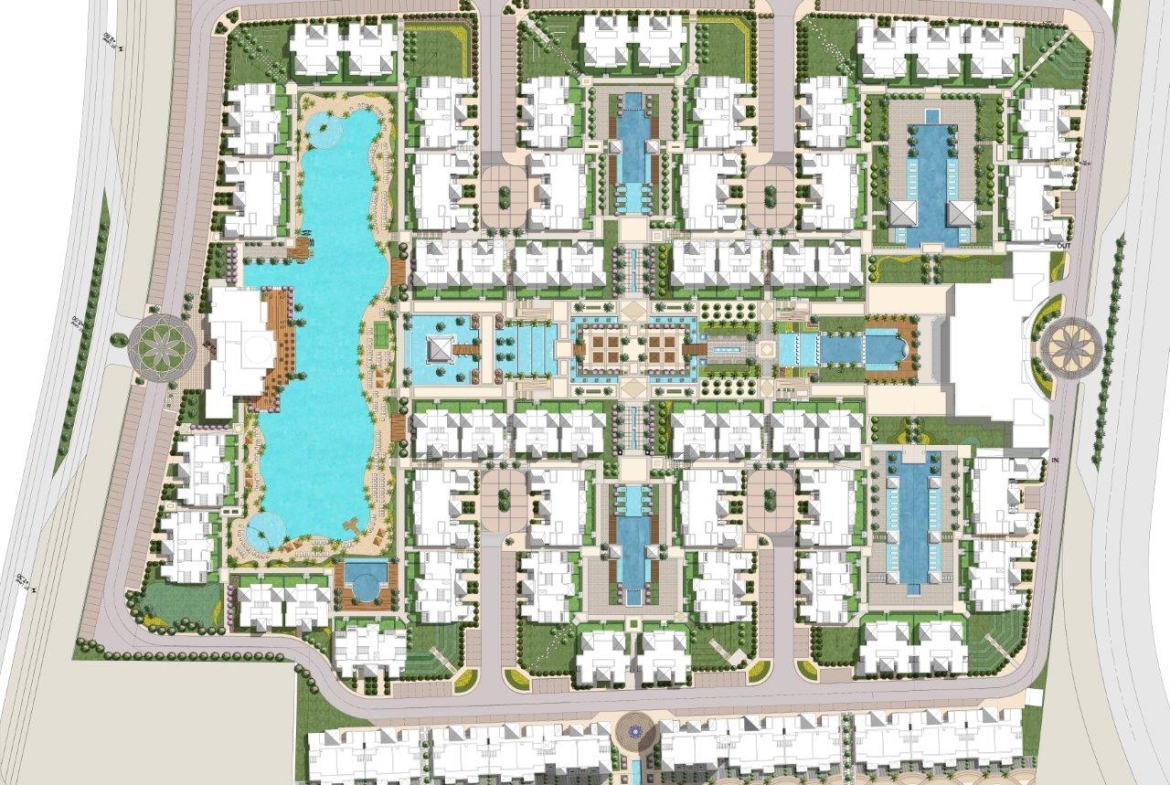 with a carefully planned layout; built-up on 18,600 m² (20%) only from total size Ground and 2 typical floors, Ground with Private Garden, Second with Roof (Penthouse) and 74,400 m² (80%) landscaped gardens, pools, and 8000m² sandy lagoon and open areas with all tourist facilities. offers a seamless blend of residential and Tourist living,